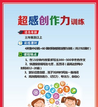 1,集中注意力,上课听得进,记得住;2,启发观察力,全面看事物,拓展大脑思维,3.打破思维禁锢,提高想象力,丰富创造力,细致观察力; 4.提升自信心,改善人际关系,敢于表达。 5.快速构思并按要求写出指定题目要求的作文; 6.任意命题,快速按意境写出七言,五言诗, 7.提高创造力,专注力,自信心。